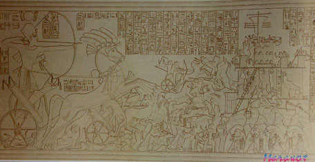 This battle was written as a poem in the 9th year of Ramesses II's reign, and the king liked it so well he had it placed in his great temples. It is preserved in a manuscript (Pap. Sallier, iii., in the British Museum) and imperfectly in the temples of Luxor, Karnak and Abydos. The battle between Ramasses II (1279-1212) and the Hittite army of Muwatalli (1296-1271 B.C.) was on the Orontes river in Syria in July 1274 B.C. The Hittites are called "Khatti" in the poem.